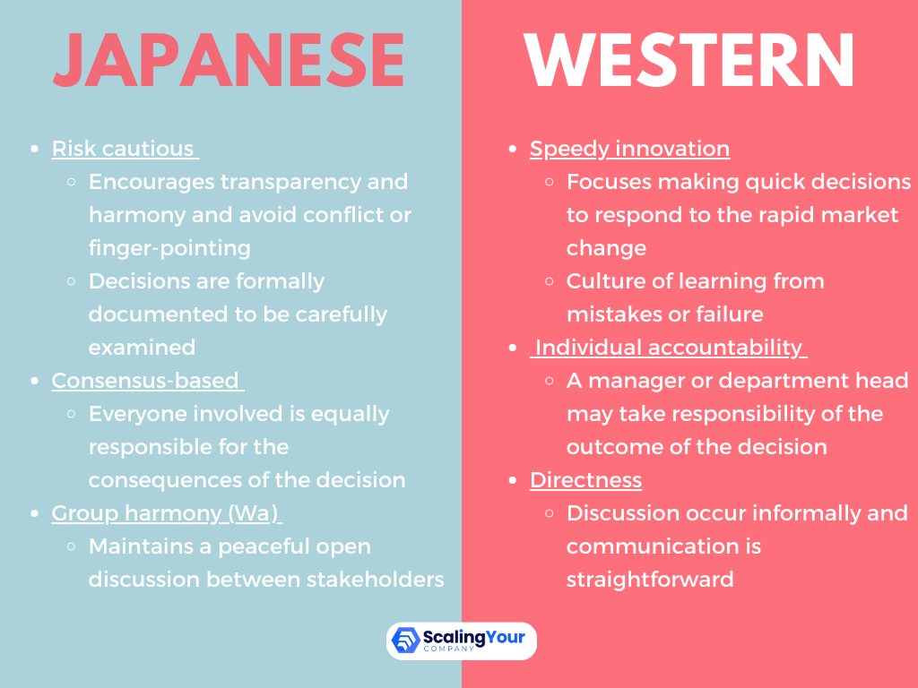 The concept of Ringisho is far different from the typical process in Western countries where agility is prioritized over hierarchy, particularly in the US. For insights into how Japan’s cultural values shape corporate practices, including seniority, refer to our Japanese Corporate Culture. In this section we will compare the different values that go into decision-making between Japanese Ringisho and the general Western decision-making method.